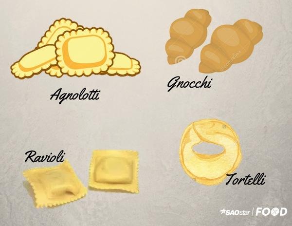 Hình dạng của những chiếc pasta cũng đa dạng tuỳ theo sự sáng tạo của đầu bếp khi gói nhân. Tiêu biểu là Gnocchi là sự kết hợp giữa bột mì và khoai tây nghiền, Agnolotti đáng yêu với hình hoa bán nguyệt được kèm nhân thịt.
