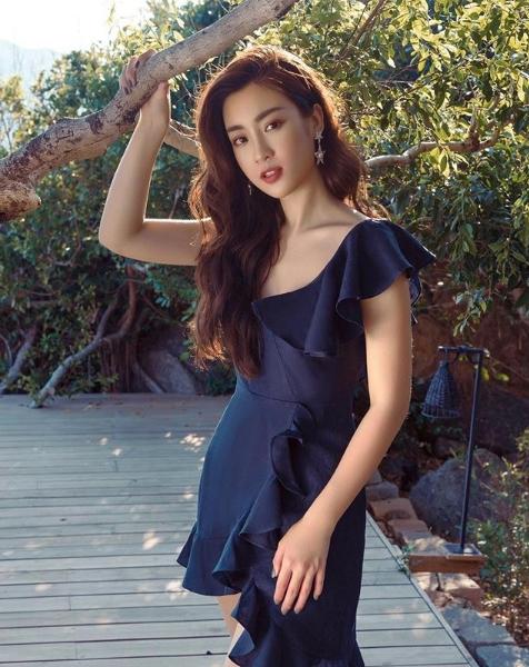 Hoa hậu Đỗ Mỹ Linh cũng bất ngờ chọn váy xanh nhưng là tông đậm hơn hẳn. Bộ đầm bèo nhún này...