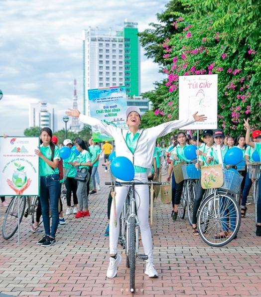 Hoa hậu H'Hen Niê lại mang phong cách năng động với áo xanh ngọc khi cùng nguyên Phó Chủ tịch nước Trương Mỹ Hoa và các em Quỹ học bổng Vừ A Dính tham gia chiến dịch hạn chế sử dụng bao ni lông.