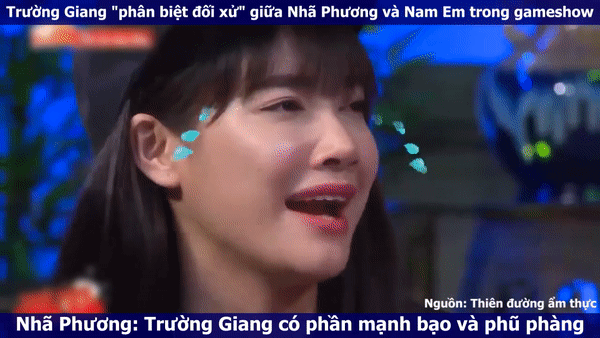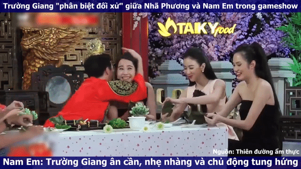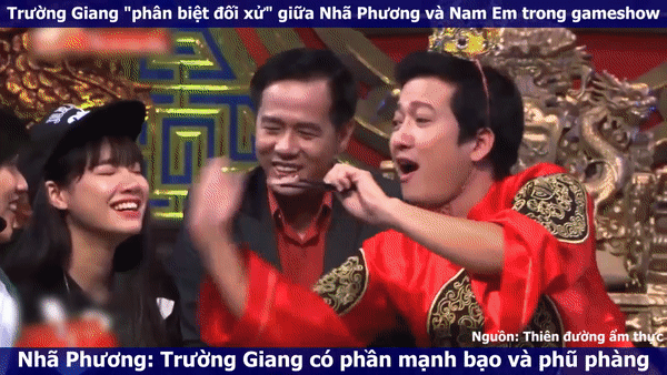 Mới đây, những tình huống đối thoại của Nhã Phương và Trường Giang hay nam danh hài với Nam Em khi tham gia show truyền hình thực tế Thiên đường ẩm thực cùng nhau đã bị đào xới trở lại. Theo đó, cách ngôi sao làng hài "phân biệt đối xử" giữa Nhã Phương và Nam Em trong gameshow khiến người xem bất ngờ.