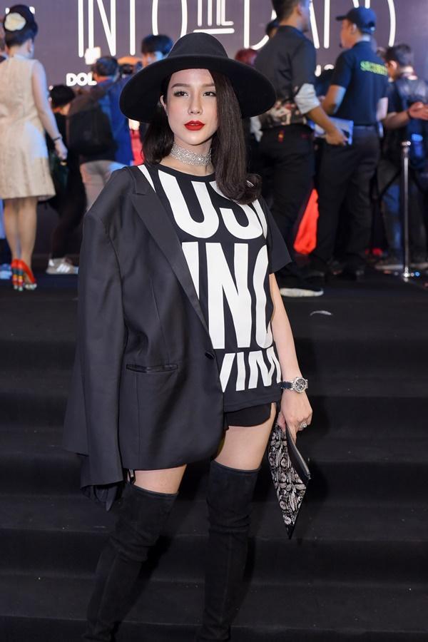 Là nhân vật đặc biệt của show diễn lần này, Ngọc Trinh chọn chiếc váy đen với những đường cắt xẻ táo bạo.