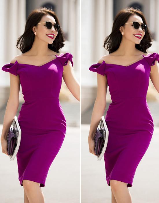 chiến" sử dụng váy bodycon. Chiếc váy tím cổ chữ V, thắt nơ điệu tại vai