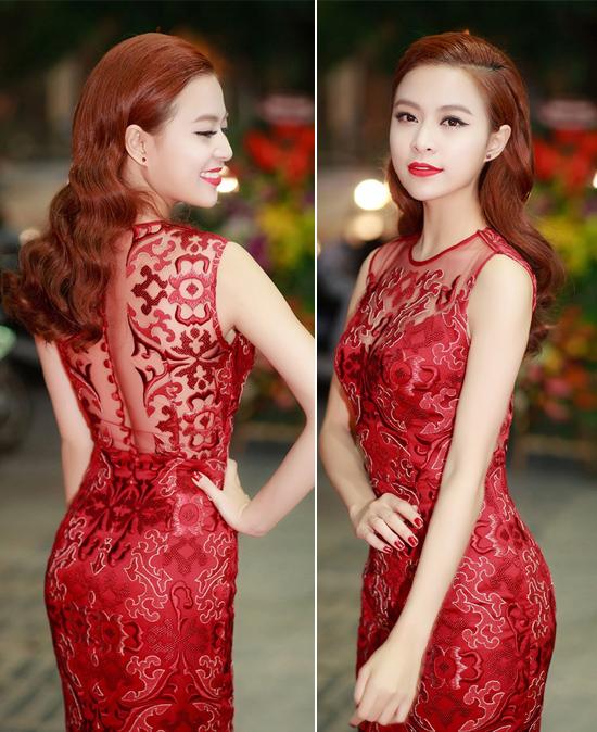 xuất hiện trước công chúng. Chiếc váy họa tiết ren đỏ giúp nữ ca sĩ nổi