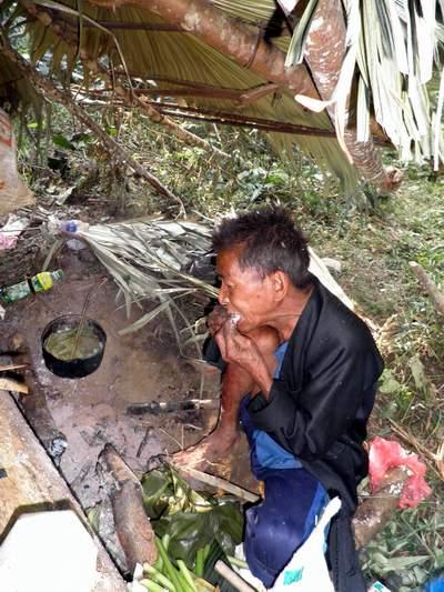 Khi chúng tôi tìm được “người rừng”, ông đang ở trong “ngôi nhà” ngay gần khe suối, tạm bợ hơn cả “nhà” mà thủa bé lũ trẻ con chúng tôi hay chơi đồ hàng. Cạnh một gốc cây to đã bị đổ xuống có một tàu lá cọ lợp tạm, chẳng đủ che mưa hay che nắng. Một vài cây củi được chụm lại thành bếp lửa. Ngày cũng như đêm, ông Phẩy chỉ có thể ngồi ôm lấy cái bếp lửa nhỏ, thứ duy nhất giúp ông ấm hơn trong những ngày đông rét buốt giữa rừng chứ không thể ngả lưng dù chỉ chốc lát.