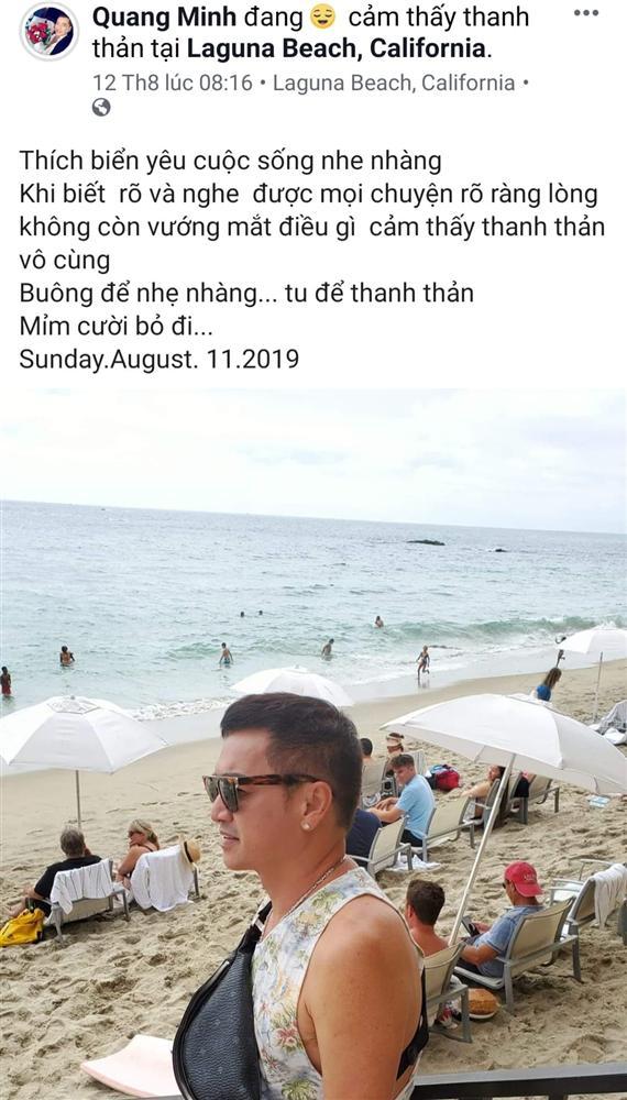 Về phía Quang Minh, anh thường xuyên thể hiện trạng thái thanh thản hay hạnh phúc trong mỗi status. Mỗi chia sẻ của nam nghệ sĩ đều nhận được sự quan tâm từ người hâm mộ. Mới đây nhất, Quang Minh đăng tấm ảnh trở về với biển, anh tâm sự về chuyện buông bỏ để lòng được thanh thản.