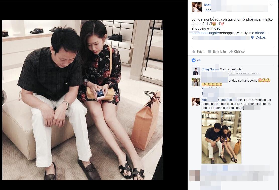 Còn Công Sơn cũng hào hứng bình luận khi em gái chia sẻ hình ảnh bên bố đi shopping. Bị anh trai chêu đùa 'sang chảnh nhỉ', cô em gái Ngọc Mai đã nhanh chóng hồi âm đưa "bằng chứng" cùng giọng điệu đầy hờn dỗi: Nhìn tấm này nữa là hết sang chảnh. Xách đồ cho cả nhà, chọn đồ cho cả anh, không thương còn kêu chảnh...