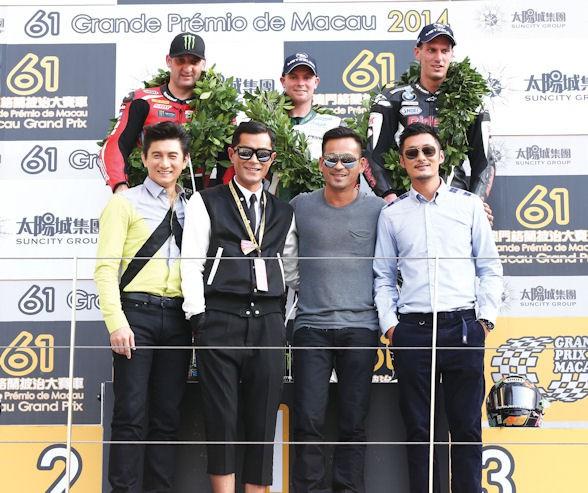 Châu Trác Hoa chụp hình cùng các tài tử hàng đầu Hoa ngữ trong một sự kiện đua xe.