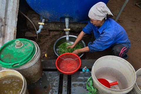 Ông Thảo đặt nồi cơm lên bếp ga, rồi mang chậu quần áo ra sông giặt. Ông bảo giặt ở sông cho tiết kiệm nước vì không phải lúc nào cũng có thể chạy máy bơm.