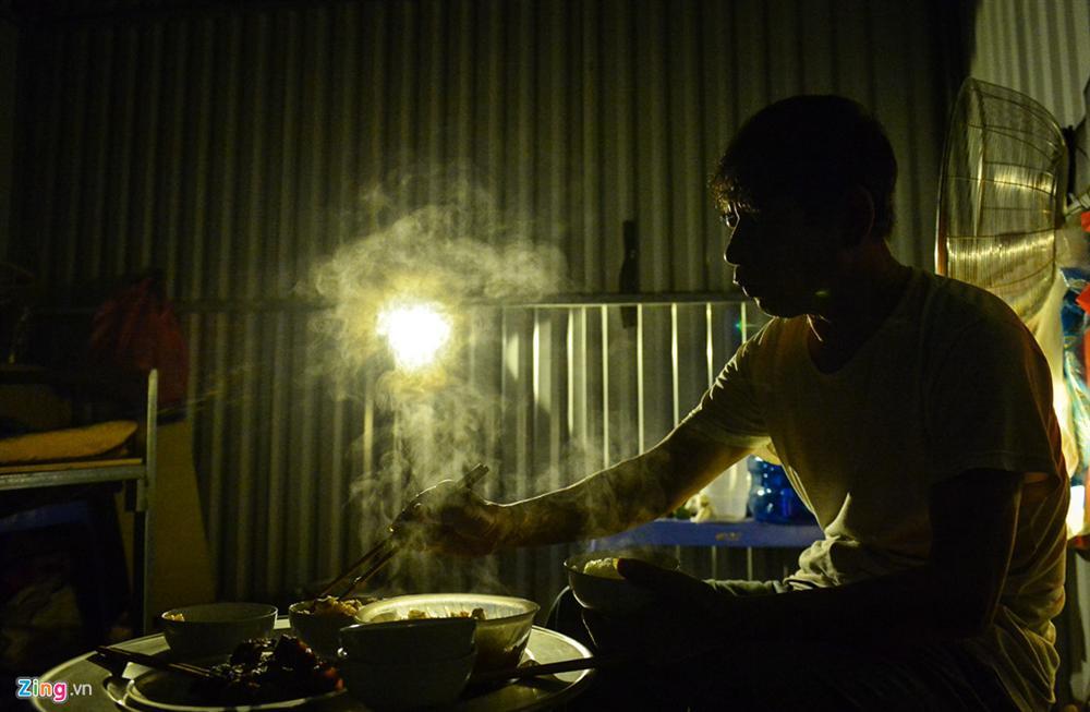 Mâm cơm tối đặt ngay trên chiếc máy nổ với mấy cái xô đựng sơn úp ngược lại làm ghế.