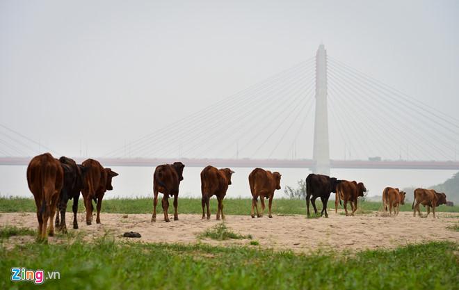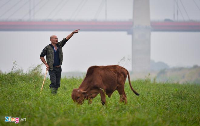 Khác với những hộ chuyên trồng trọt, anh Dũng có hơn 50 con bò, là người chăn nuôi lâu năm nhất trên đảo. Anh có nhà riêng ở Nhật Tân nhưng hàng ngày vẫn ăn ngủ tại chỗ để trông nom đàn bò. Gầm cầu trở thành “mái che nghìn tỷ” được anh tận dụng.