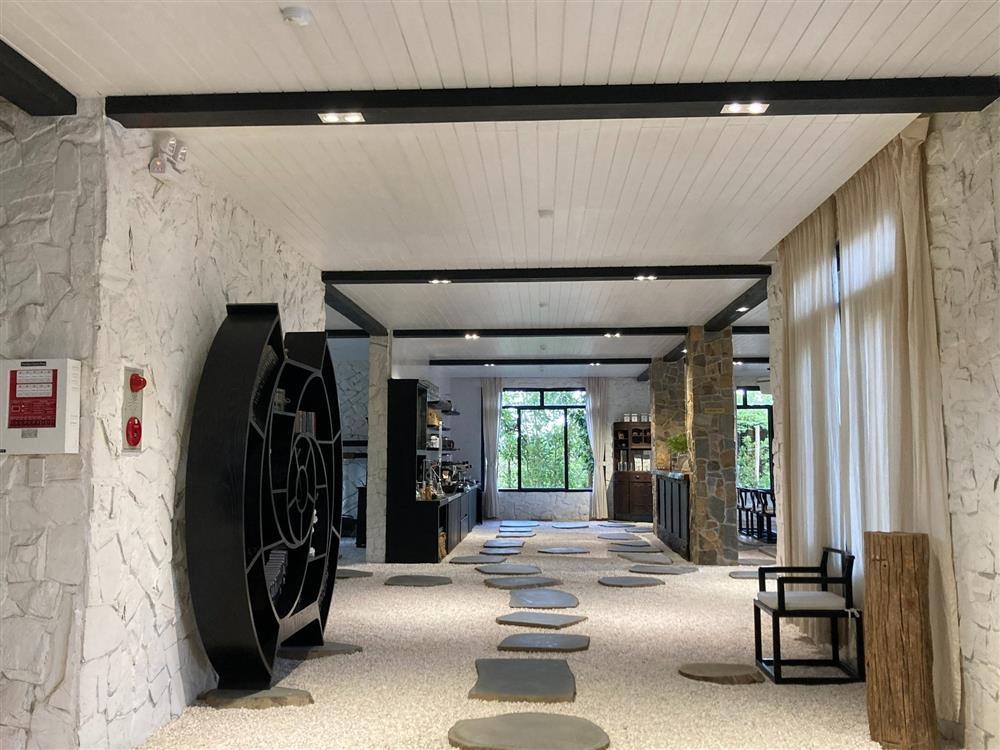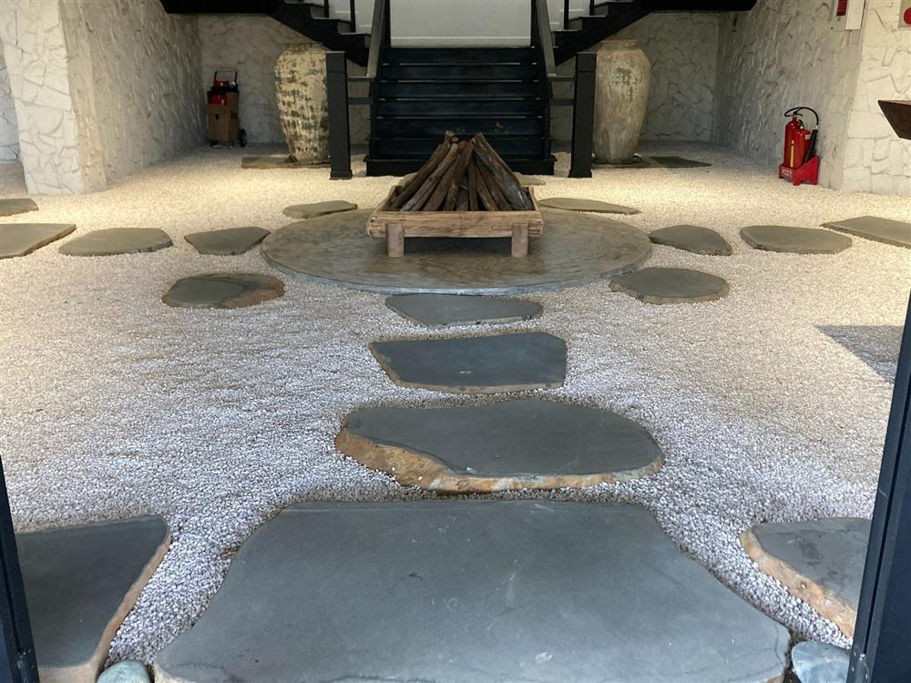 Nền nhà được rải đá dăm trắng, lối đi là những phiến đá lớn hơn, màu sẫm nổi bật. Chính giữa sảnh tầng trệt đặt một khối hình vuông, bên trong là những gộc củi khô gác lên nhau, hệt cái bếp lửa.