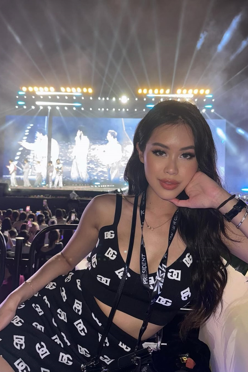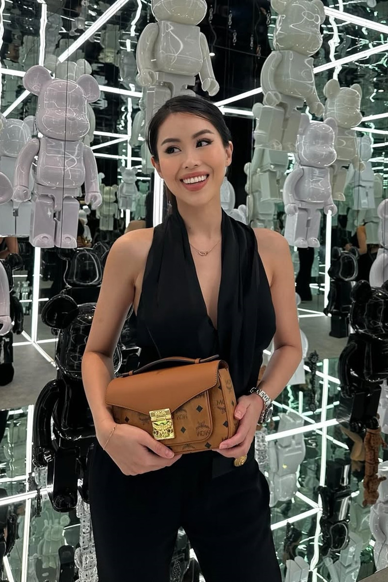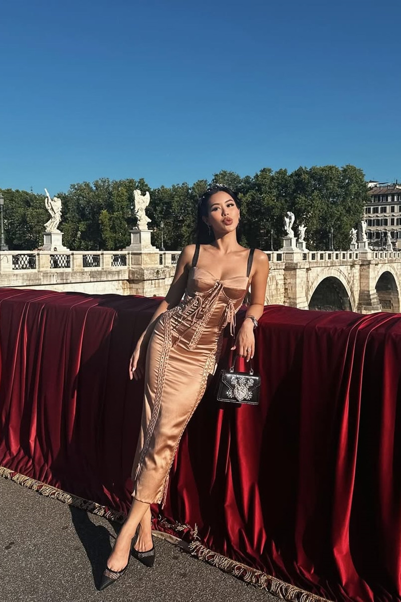 Những chuyến du lịch xa hoa cũng là dịp để Tiên Nguyễn khoe gu thời trang tinh tế. Tại Milan, cô tạo dáng bên Nhà thờ Duomo với áo ba lỗ đen, váy da đen và boots chunky, kết hợp túi MCM nâu. Ở Rome, cô chọn váy lụa đồng ánh kim có chi tiết dây thắt eo phức tạp, kết hợp túi Dolce&Gabbana mini đính pha lê.