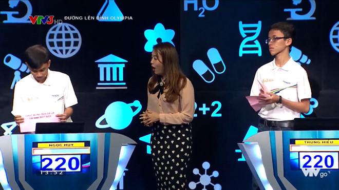 Cùng giữ điểm số nhì tuần cao nhất 220, Ngọc Huy và Vương Trung Hiếu (THPT Chuyên Lê Quý Đôn, Khánh Hòa) phải bước vào phần thi phụ để quyết định ai sẽ sở hữu tấm vé cuối cùng vào cuộc thi tháng 2, quý III.