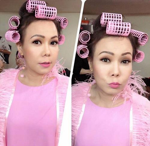 Việt Hương cũng sử dụng lô cuốn để làm đẹp cho mái tóc của mình. Điều làm khán giả thích thú hơn cả là sự tone sur tone của lô cuốn và bộ quần áo chị đang mặc trên người.
