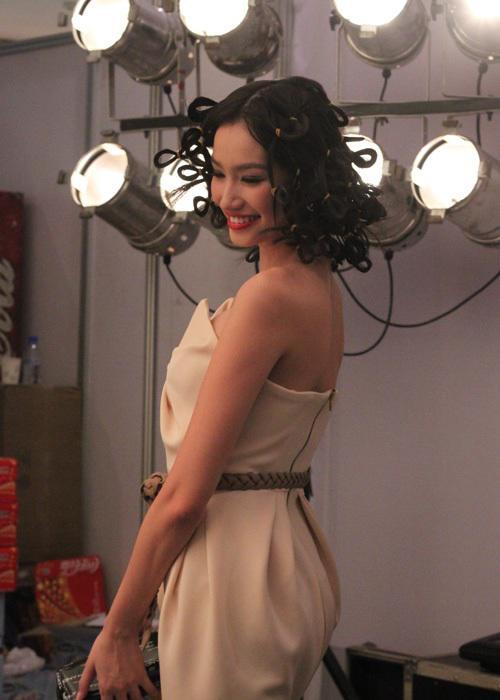 Hình ảnh hậu trường của Trúc Diễm khiến khán giả phì cười khi trên đầu toàn chun là chun. Những chiếc chun này sẽ giúp cô có được mái tóc bồng bềnh quyến rũ nhất khi xuất hiện.