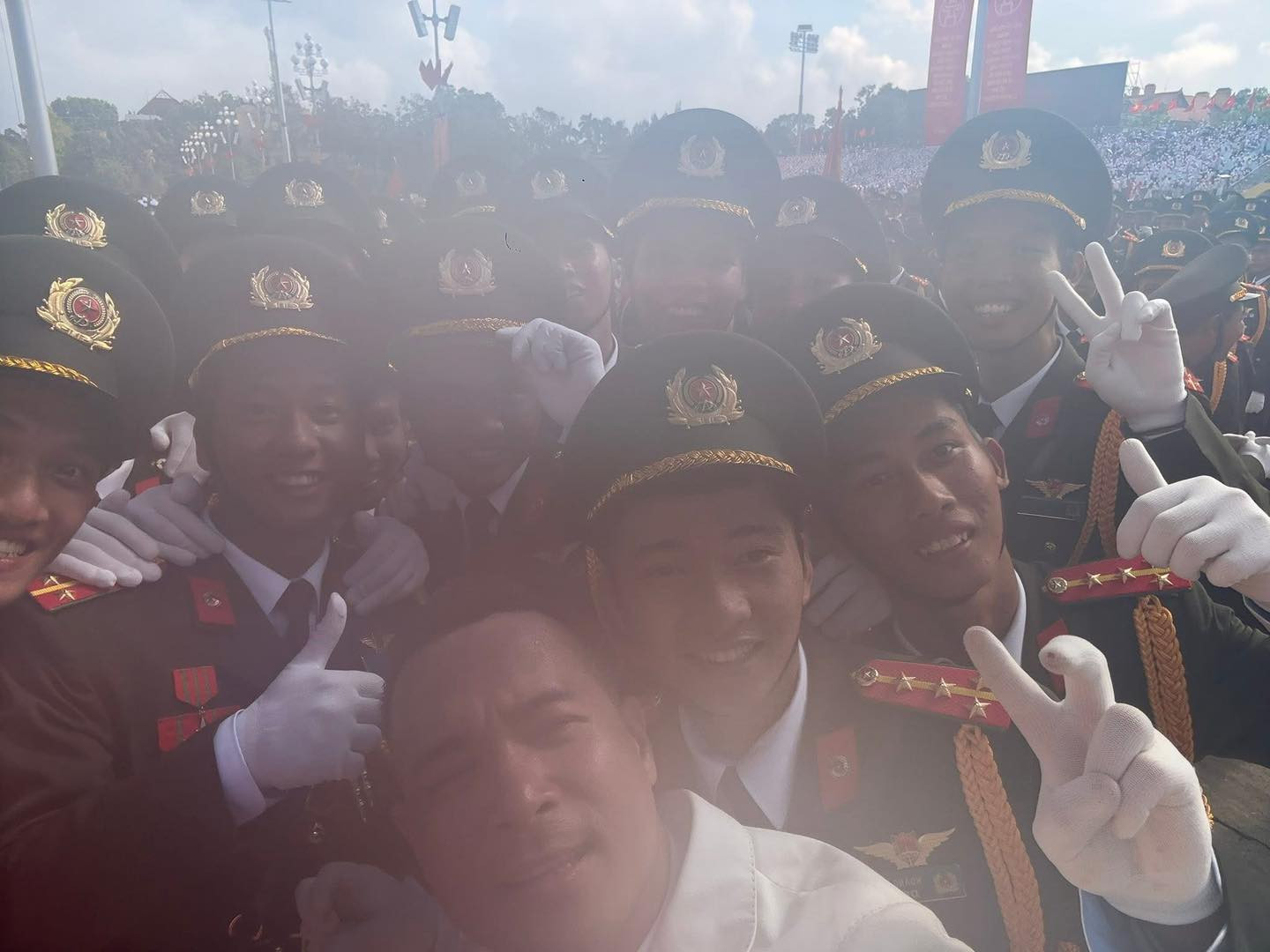 Sau đại lễ, loạt ảnh kỉ niệm A80 của Trương Thế Vinh đang gây sốt cõi mạng vì bị "cháy sáng" hết cả khiến mặt anh cùng các chiến sĩ đều đen thui.