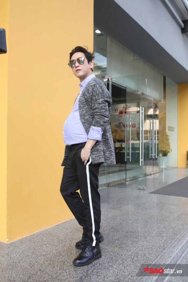 “Ông bầu” lịch lãm với áo sơ-mi mix cùng cardigan, đi kèm quần chạy sọc dọc