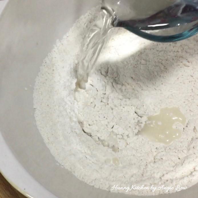 Bước 1: Trong 1 tô trộn đèu gnuyeen liệu phần bột ướt: cho bột mì, men nở, đường vào trộn đều sau đó cho nước ấm vào trộn cho tới khi hỗn hợp đồng nhất.