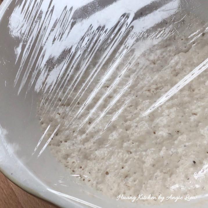 Bước 2: Dùng màng bọc thực phẩm bọc kín, ủ bột khoảng 12 tiếng hoặc ít nhất là qua đêm. Đây được coi là bột cái.