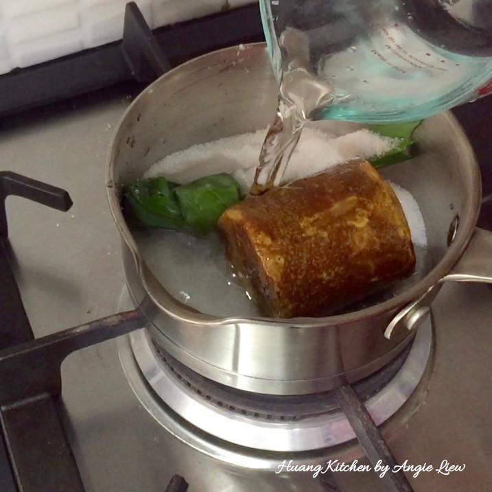 Bước 3: Cho đường thốt nốt, đường trắng, lá dứa đã rửa sạch, nước vào nồi. Đun sôi thì giảm nhỏ lửa.