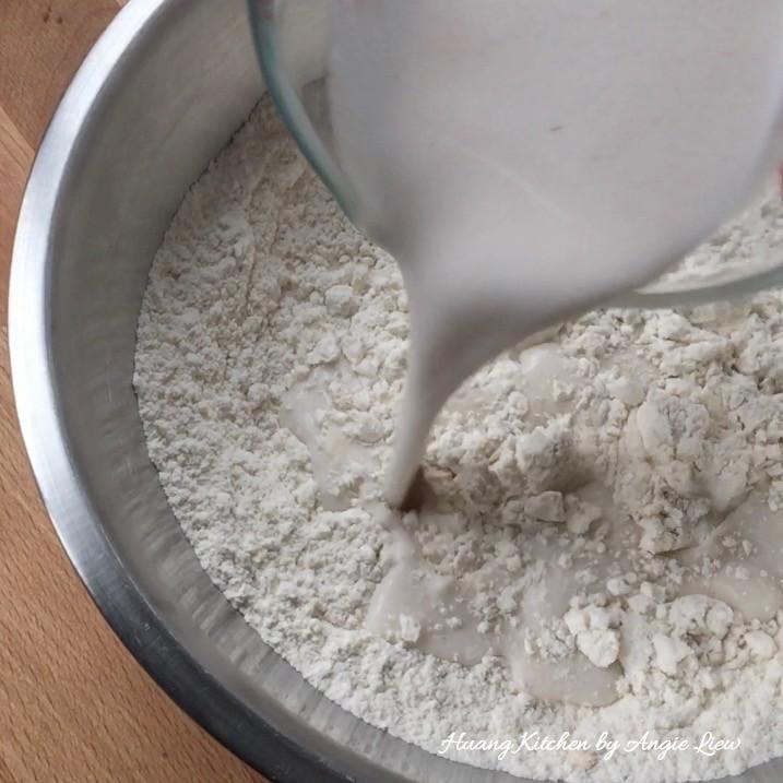 Bước 5: Trong 1 tô trộn khác, cho bột mì, đường, bột nở vào trộn đều sau đó từ từ đổ nước cốt dừa vào trộn kỹ.