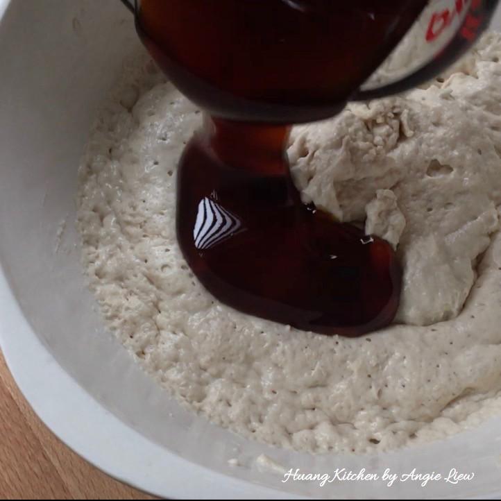 Bước 6: Phần bột cái đã ủ xong thì cho siro đường thốt nốt vào trộn đều.