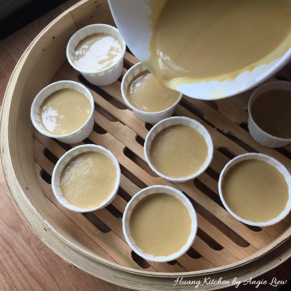 Bước 8: Đặt nồi hấp lên bếp đã có sẵn nước. Xếp cup giấy vào, đổ bột vào từng cup, lượng bột đổ chỉ vào khoảng 3/4 cup giấy thôi nhé!
