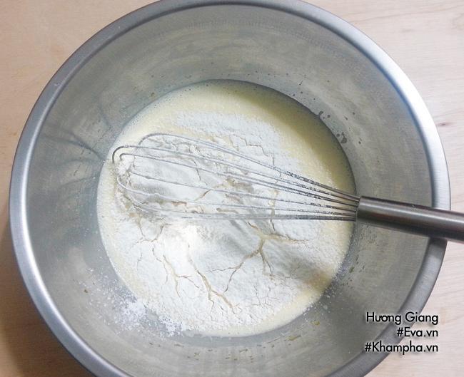 - Cho bột mì, bột nở, bột vani vào tô trứng vừa đánh rồi khuấy đều cho đến khi không còn nhìn thấy bột khô là được, để bột nghỉ 10 phút.