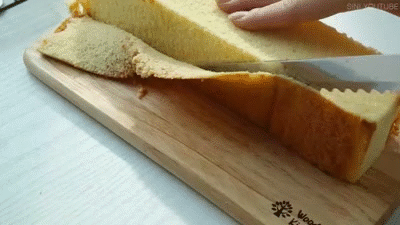 - Cắt phần rìa bánh bông lan để riêng và chia bánh thành những miếng chữ nhật nhỏ.