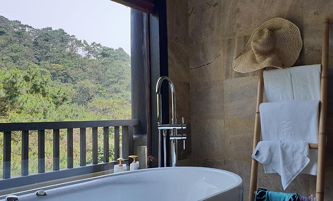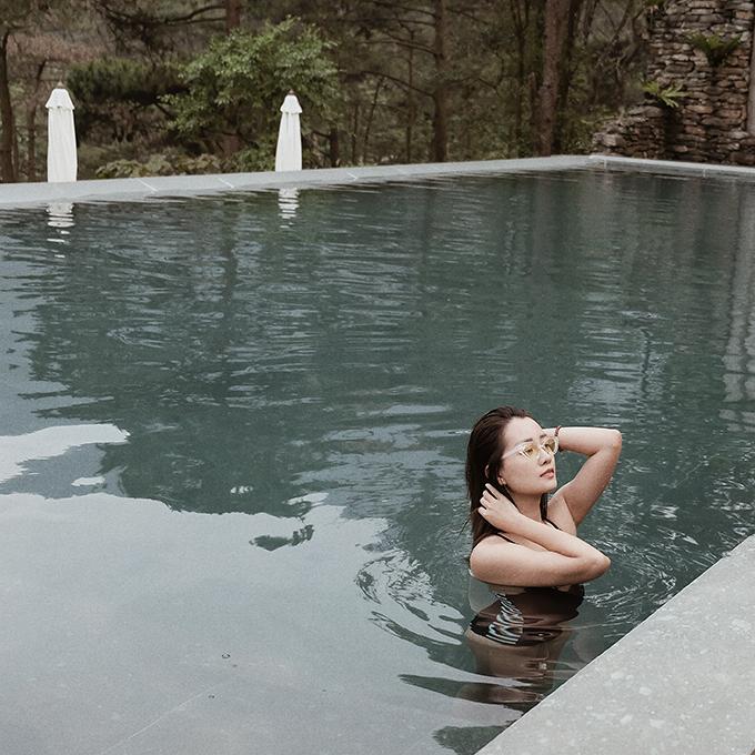 Nhóm bạn của Quỳnh Chi – Thuỳ Dung có 5 người nên book villa Family Junior Suite rộng khoảng 80 m2, gồm 2 phòng ngủ, ban công và bể bơi. Biệt thự này có kiến trúc kiểu Pháp, có 2 tầng với hầu hết các phòng ngủ đều không gian thoáng nhờ những cửa kính rộng nhìn ra khung cảnh núi rừng bên ngoài. Buổi sáng ngủ dậy, chỉ cần vén tấm rèm là bạn có thể phóng tầm mắt ngắm rừng thông, nghe tiếng chim hót véo von.