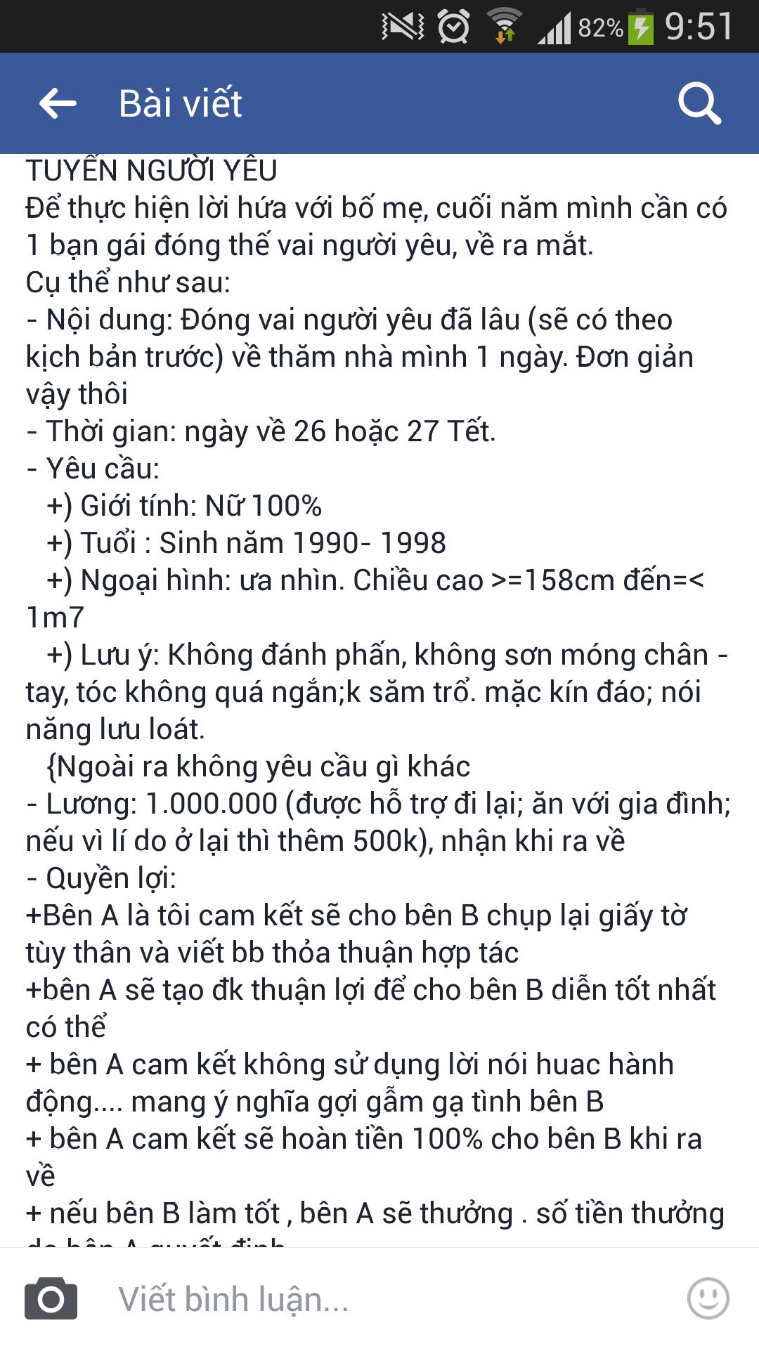 Theo như bảng thông báo tuyển người yêu, chàng trai này sẽ trả cho cô gái nào “đóng vai” người yêu về ra mắt bố mẹ dịp Tết với mức lương 1.000.000 đồng. Cô gái cũng sẽ được chàng trai hỗ trợ đi lại, ăn với gia đình, nếu vì lý do ở lại nhà sẽ được anh chàng trả thêm 500.000 đồng. Toàn bộ số tiền sẽ được trao cho cô gái sau khi nhiệm vụ ra mắt hoàn thành.