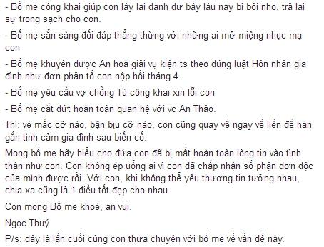 Khép lại bức tâm thư, Ngọc Thúy khẳng định "đây là lần cuối cùng con thưa chuyện với bố mẹ về vấn đề này. Mong bố mẹ hãy hiểu cho đứa con đã bị mất hoàn toàn lòng tin vào tình thân như con. Con không ép uổng ai vì con đã chấp nhận số phận đơn độc của mình được rồi. Với con, khi không thể yêu thương tin tưởng nhau, chia xa cũng là một điều tốt đẹp cho nhau".