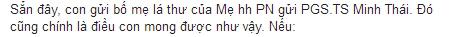 "Con định thêm 1,2 tuần để thẩm định rõ những cảm nhận của con về chia sẻ bố đăng rồi sẽ trả lời. Nhưng bây giờ thì không cần đợi nữa khi mọi thứ đã được phơi bày rõ ràng. Nhiều câu hỏi tại sao trong đầu con hơn là xúc động sau khi đọc những lời lẽ của bố.