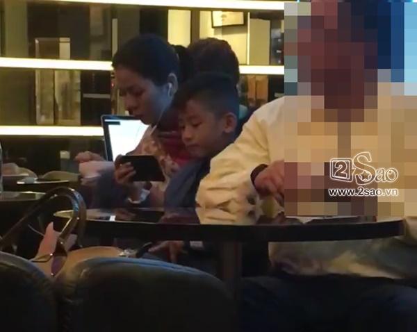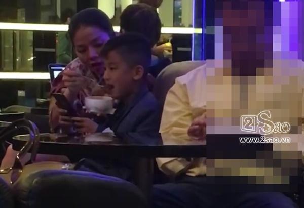 Hình ảnh con trai của Lệ Quyên vừa ngồi xem điện thoại vừa chờ mẹ đút cho ăn