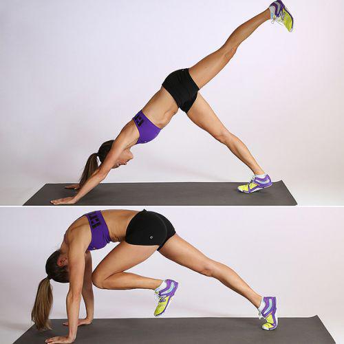 - Vẫn bắt đầu mới tư thế Plank, nâng người lên thành hình chữ V, đá chân trái thẳng ra sau lên cao sao cho chân đá ra sau và thân người bạn tạo thành đường thẳng.