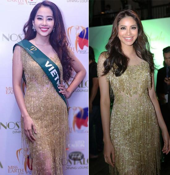lánh ánh kim tua rua giống y như Phạm Hương từng mặc tại một sự kiện hồi tháng 4. Sự