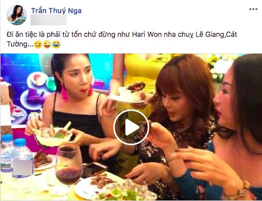 Bên cạnh cuộc trò chuyện và hành động "diễn sâu" tại bữa tiệc, bộ ba nghệ sĩ bất ngờ nhắc đến "thánh ham ăn" Hari Won: "Đi ăn tiệc là phải từ tốn chứ đừng như Hari Won nha chị Lê Giang, Cát Tường", Thúy Nga lên tiếng.