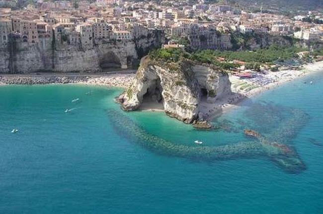 Thị trấn Tropea nằm trên đỉnh một dãy đá ngầm và nhìn xuống biển Tyrrhenian với nước trong xanh. Bãi biển ở đây thu hút rất đông du khách và người nổi tiếng đến từ khắp nơi trên thế giới.