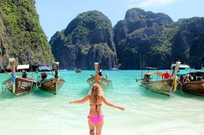Hòn đảo Koh Phi Phi Leh ở Thái Lan nổi tiếng với dãy núi đồi đá vôi chạy quanh bãi biển Maya Bay với cát trắng và nước trong xanh. Du khách có thể tới địa điển này bằng cách đi tàu biển trong vòng 1 giờ.