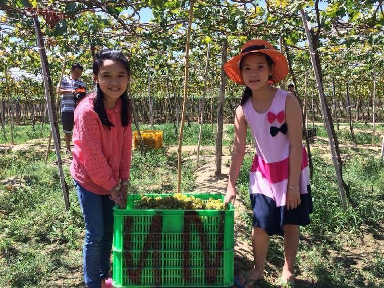 Các em nhỏ rất hào hứng khi được trải nghiệm cùng tham gia công việc thu hoạch nho.