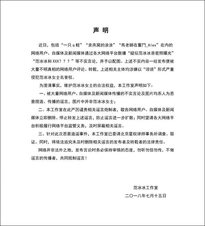 Phòng làm việc Phạm Băng Băng ra thông cáo phủ nhận hình ảnh nóng, yêu cầu người dùng mạng ngừng phát tán tin đồn và khởi kiện những người làm ảnh hưởng tới danh dự, hình tượng của cô