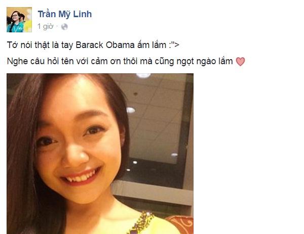Theo như tìm hiểu, cô gái "hot nhất Vịnh Bắc Bộ" này tên thật là Trần Mỹ Linh. Ngay sau khi được diện kiến Tổng thống Obama, Mỹ Linh không giấu nổi niềm vui và sự tự hào trên trang Facebook cá nhân. Cô viết: "Tớ nói thật là tay Barack Obama ấm lắm. Nghe câu hỏi tên và cảm ơn thôi cũng ngọt ngào lắm".