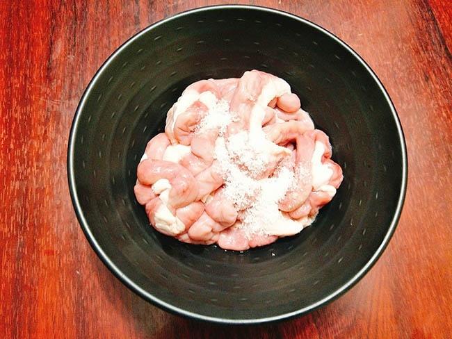 - Bước 1: Lòng non cho vào tô cùng với 1 thìa giấm, 1 thìa muối và bóp kỹ sau đó rửa lại vài lần với nước cho thật sạch mùi hôi.
