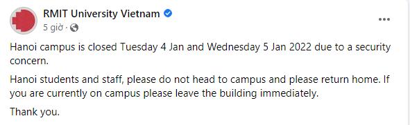 "Hanoi campus is closed Tuesday 4 Jan and Wednesday 5 Jan 2022 due to a security concern.