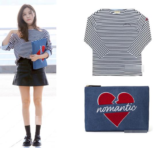 Hyomin cá tính và ấn tượng với áo kẻ sọc ngang và ví cầm tay hiệu Beyond Closet.