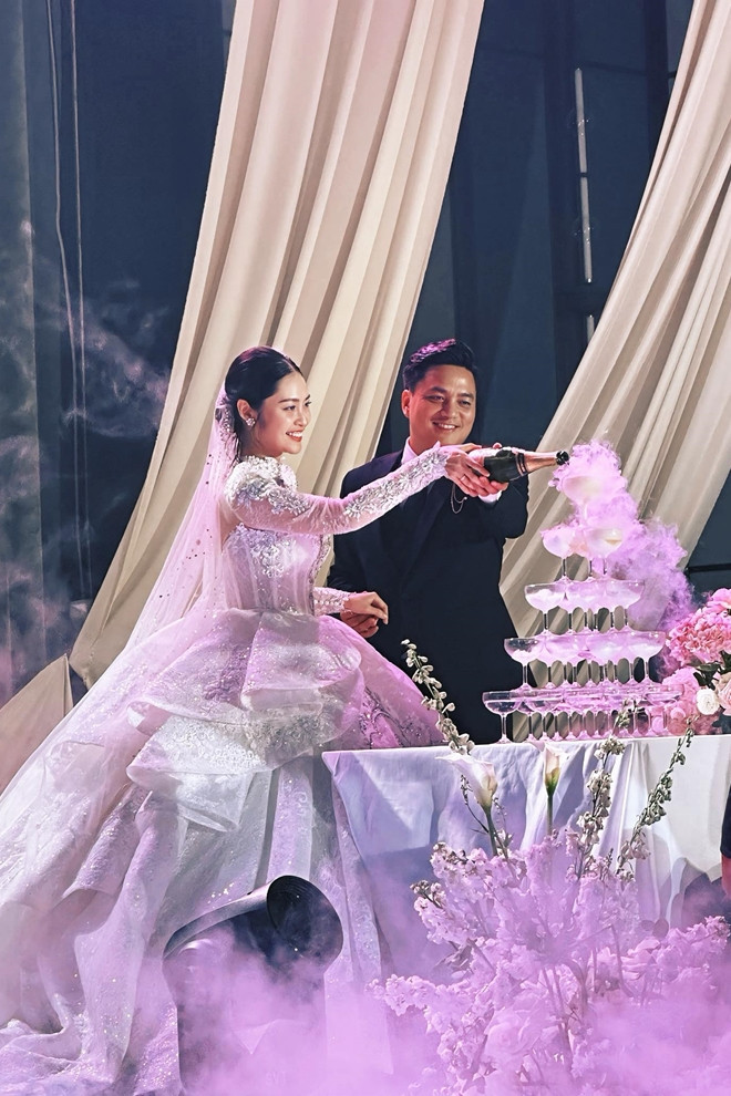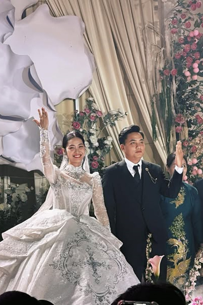 Đến 19h, trong ánh đèn lung linh và tiếng vỗ tay chào đón của quan khách, cô dâu Nông Thúy Hằng xuất hiện lộng lẫy trong bộ váy cưới xếp tầng được đính kết tinh xảo. Khoảnh khắc xúc động nhất là khi cô khoác tay bố bước vào lễ đường, thể hiện sự trân trọng với truyền thống gia đình.