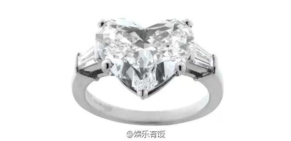 Nhẫn cưới dùng trong hôn lễ thuộc kiểu nhẫn bạch kim đính kim cương với viên kim cương hình trái tim ở giữa lên tới 5.03 kara, 2 viên kim cương phụ ở 2 bên 0.46 kara