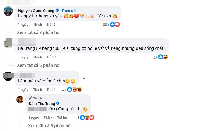 Bài đăng của nữ người mẫu nhanh chóng hút hơn 28 nghìn lượt thích. Netizen đồng loạt gửi lời chúc mừng sinh nhật đến Đàm Thu Trang. Đáng chú ý, một cư dân mạng để lại bình luận kém duyên: "Làm màu và diễn là chính".