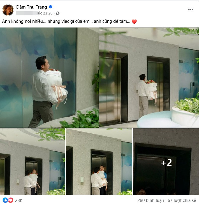 Mới đây, trên trang cá nhân, Đàm Thu Trang khoe khoảnh khắc được ông xã Cường Đô La bất ngờ tặng hoa dịp sinh nhật. Người đẹp đăng hình kèm dòng trạng thái: "Anh không nói nhiều… nhưng việc gì của em… anh cũng để tâm."