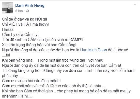 Nam ca sĩ đồng thời nhắn với chị Tư, sản phẩm được ra đời trong một lần “vụng dại” giữa anh và Minh Vy. “Khi nào bạn Cẩm Ly có thời gian, cho phép tui mang bé đến để ra mắt mẹ Ly”, Mr. Đàm hài hước.